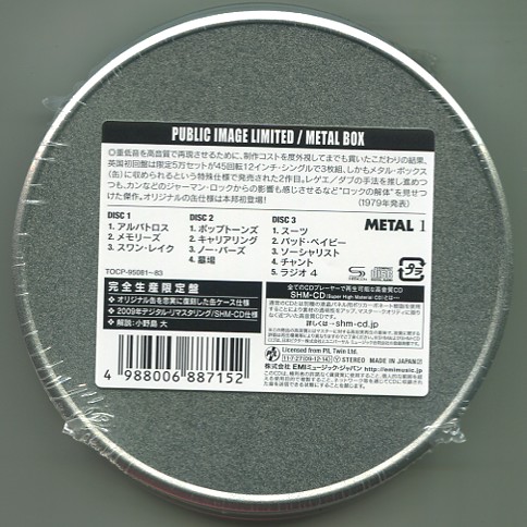 TOCP-95081/3 (もったいなくて開封できていない):ちょっと表面処理がされた材質![]() ![]() MTLCD 1 (CD):表面材質は少しヘアーラインのある普通のもの ![]() ![]() MTLCD 1 に付属のリーフ (150 DPI) ![]() METAL 1 (レコード) のカン。 45rpm 3 枚組。そろそろ、サビが心配。 ![]() | |